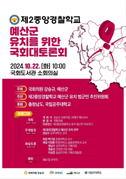 이번 토론회는 강승규 국회의원과 예산군이 공동 주최하며 제2중앙경찰학교의 예산군 유치를 통해 지역 경제 활성화와 경찰 교육의 질적 향상을 도모하는 것을 목표로 한다.