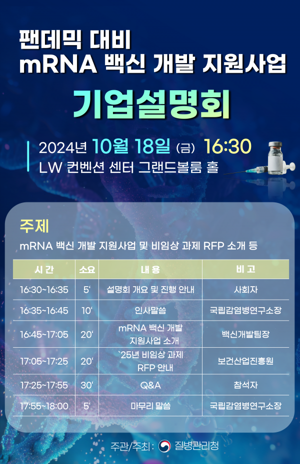 [Q뉴스] 질병관리청은 ‘팬데믹 대비 mRNA 백신 개발 지원사업’ 설명회를 10월 18일에 개최한다고 밝혔다.