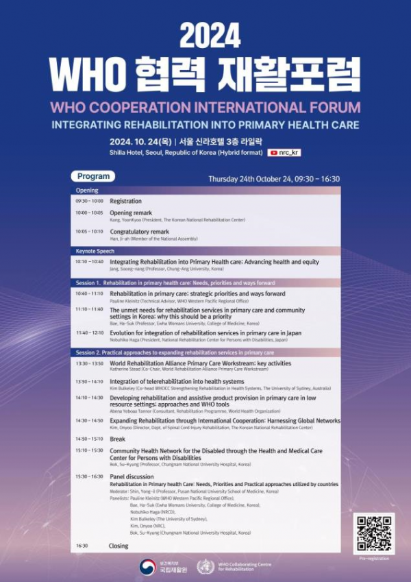또한, WHO의 일차의료에서의 보조기기 제공지원에 대해 WHO의 아베나 타노르 컨설턴트가 소개해주며 국제협력을 통한 재활 확장: 글로벌 네트워크의 활용에 대해 국립재활원 김온유 과장이 발표한다.