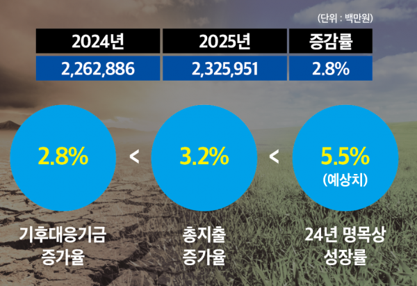 2025년 기후대응기금 지출액은 2조 3,260억원으로 전년대비 2.8%증가했다.