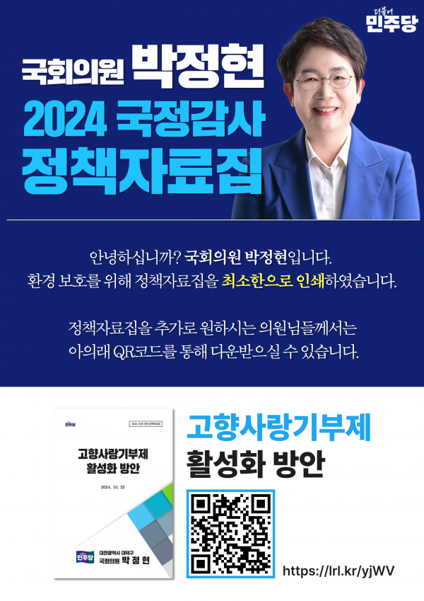[Q뉴스] 국회 행정안전위원회 소속 박정현 국회의원은 2024년 국정감사를 맞아 25일 ‘고향사랑기부제 활성화 방안’ 정책자료집을 발간했다고 밝혔다.
