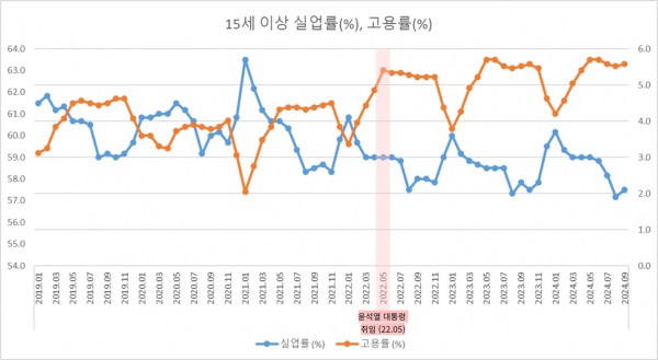 [참고1] 윤석열 정부 출범 이후 고용률과 실업률 현황 또한 “지난 8월 기준 전체 취업자의 54.6%가 근로시간 36시간 미만의 단기근로자로 코로나가 확산 된 2020년 23.6%보다 두 배 이상 증가했고 뚜렷한 이유 없이 노동시장을 떠나는 구직단념자 인구 역시 8월 기준 256만 7천 명으로 2003년 통계 집계이래 최대임에도 일시적인 수치로 경제가 살아났다고 오판하고 있다”고 지적했다.