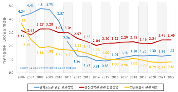 2022년 중환자실 환자에서의 침습적 기구 사용 관련 감염 발생률은 기구사용일수 1,000일당 요로감염 1.31건, 혈류감염 2.45건, 폐렴 0.81건으로 전년과 동일하거나 증가했다.