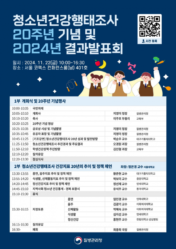 한편 11월 22일 코엑스에서 개최되는 ‘청소년건강행태조사 20주년 기념 및 2024년 결과발표회’에서는 20주년 기념행사로 조사 사업의 성과와 발전 방향에 대한 발표가 진행되며 그간 열정과 헌신으로 본 조사에 기여한 유공자와 최다 참여학교에 공로상과 표창을 수여한다.