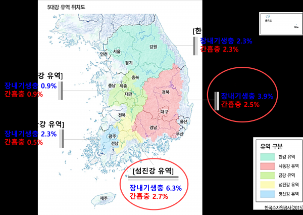 그러나 낙동강 및 섬진강 유역 일부 지역은 아직도 10% 이상의 높은 감염률이 지속됨에 따라 해당 지역 집중조사와 함께 식습관 개선 홍보 등의 장내기생충 퇴치를 위한 적극적 노력이 필요한 것으로 확인됐다.