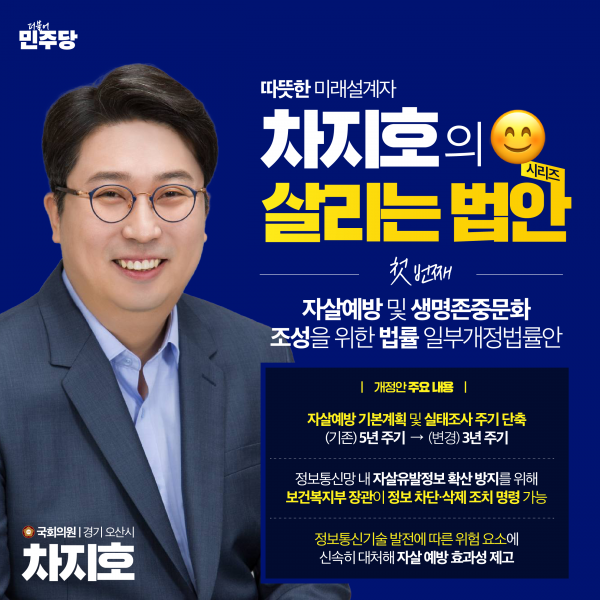 이에 차지호 의원은 “변화하는 사회·기술 환경에 맞춰 자살예방정책의 유연성을 높이기 위해 법안을 발의했다”며 “우리 사회의 귀중한 생명을 보호하는 데 크게 기여할 것”이라고 입법 취지를 설명했다.