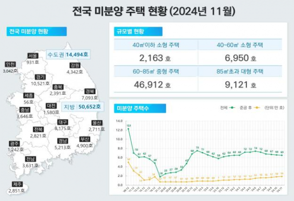 미분양 주택은 65,146호로 전월 대비 1.0% 감소했지만, 준공 후 미분양은 18,644호로 전월 대비 1.8% 증가했다.