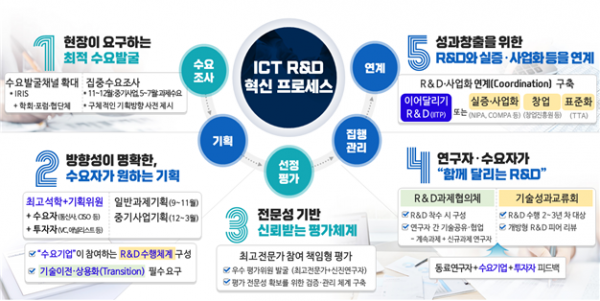 정보통신기술 분야는 현장이 요구하는 최적 수요를 발굴해, 방향성이 명확한 수요자가 원하는 연구개발 기획을 추진하고 전문성 기반의 신뢰받는 평가체계와 기술 공유·축적 및 연구자 간 시너지 강화를 위한 과제협의체, 기술·성과교류회의 운영 등 기술수요조사부터 기획·평가·관리와 성과환류에 이르는 정보통신기술 연구개발 과정 전주기를 개선할 계획이다.