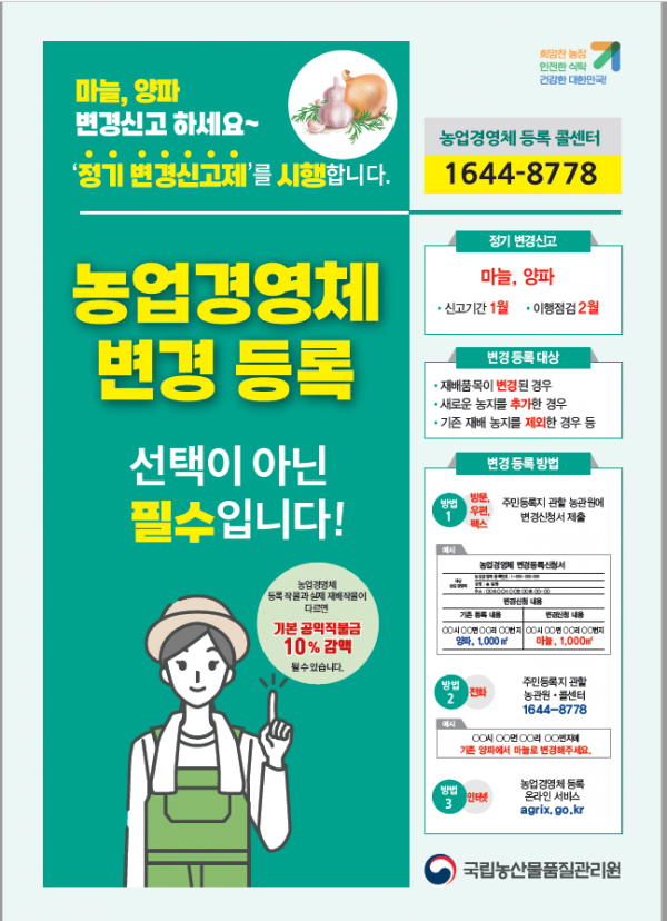 [Q뉴스] 국립농산물품질관리원은 1월 2일부터 31일까지 양파·마늘을 경작하는 농업경영체를 대상으로 등록정보에 대한 ‘정기 변경신고 기간’을 운영한다.