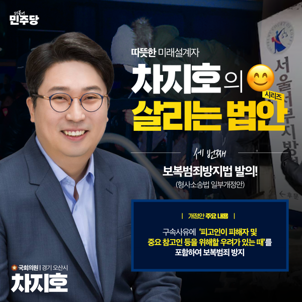 한편 이번 '형사소송법 개정안'은 ‘차지호 국회의원의 살리는 법안 시리즈’ 중 세 번째 법안으로 앞으로도 생명, 안전, 민생을 보호하는 법안을 지속적으로 발의할 것으로 알려졌다.
