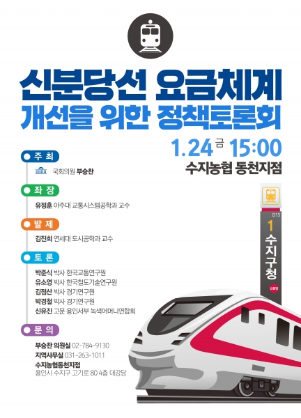 부승찬 의원은 “수지구민에게 큰 부담이 되는 수도권 최고 수준 요금인 신분당선 요금 체계 개선을 위한 해결책을 모색할 수 있는 자리가 될 것”이라고 개최 배경을 설명했다.