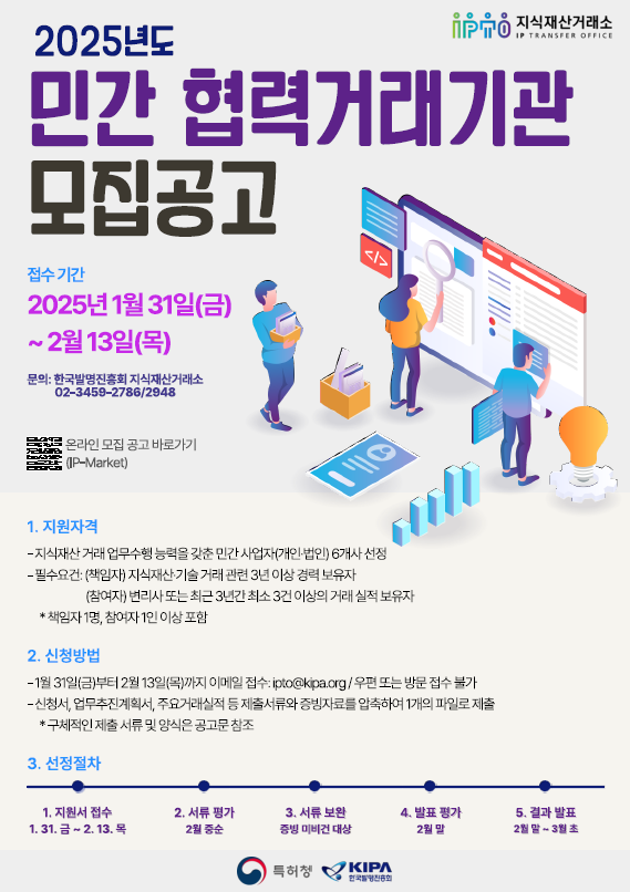 모집 대상은 지식재산 거래 업무수행 능력을 갖춘 법인 사업자 또는 개인 사업자로 참여를 희망하는 거래기관은 1. 31.~2. 13.까지 지식재산거래소 공식 이메일로 신청할 수 있다.