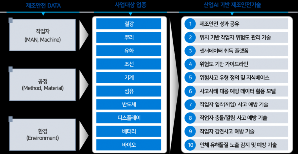 2025년부터 2029년까지 제조업 주요 10개 업종에 대해 AI 기반 제조안전시스템 개발을 지원할 예정으로 2025년에는 배터리·석유화학·섬유 등 3개 업종 신규과제 및 사업자를 공모한다.