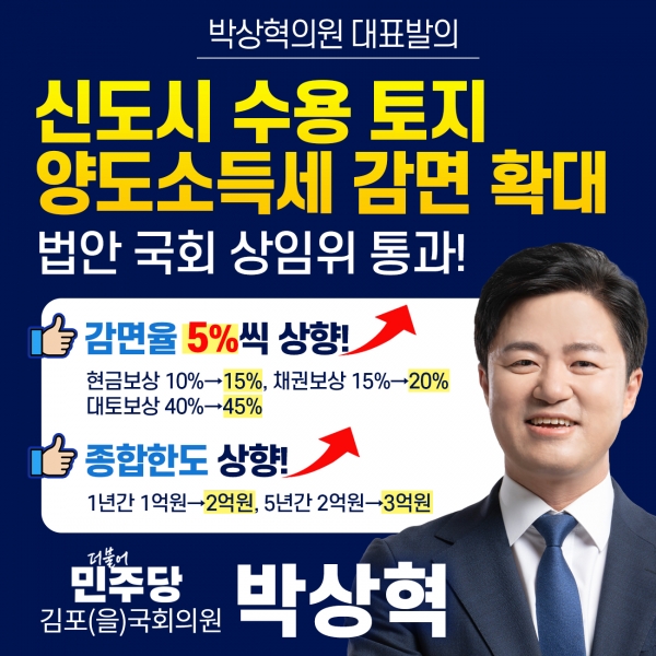박상혁 의원은 21대 국회에서부터 양도소득세 감면률 및 한도 상향을 추진해왔으며 22대 국회 들어 이를 재발의 하며 비슷한 문제를 겪고 있는 타 지역 국회의원들과도 소통을 해왔다.