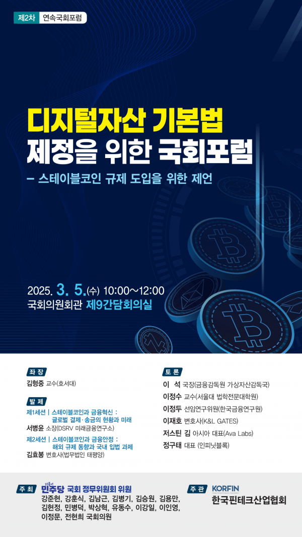 총 6 회차 중 이날은 2 회차로 ‘ 스테이블코인 규제 도입을 위한 제언 ’ 을 주제로 글로벌 결제 · 송금 인프라로서 스테이블코인의 규율체계 방향성을 논의한다.