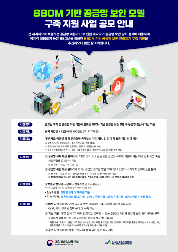 [Q뉴스] 과학기술정보통신부는 한국인터넷진흥원과 함께 국제적 규제 및 소프트웨어 공급망 위협에 대응하기 위해 국내기업들의 소프트웨어 공급망 보안 관리체계 구축 및 운영 전반에 대해 지원하는 ‘소프트웨어 자재명세서 기반 소프트웨어 공급망 보안모형 구축 지원사업’을 본격 추진한다고 밝혔다.