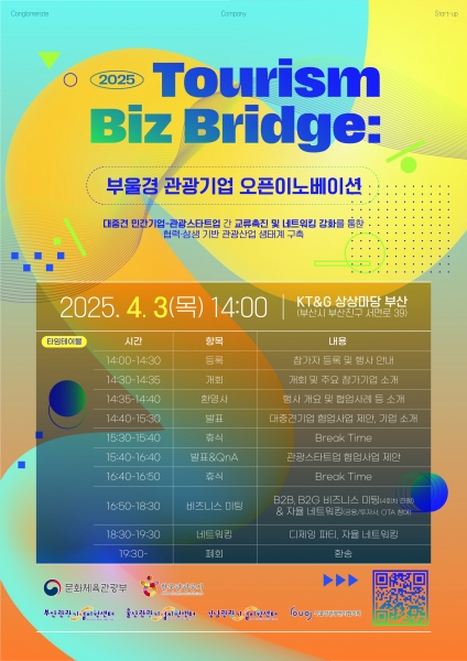 [Q뉴스] 한국관광공사는 4월 3일 KT&G 상상마당 부산에서 ‘2025 Tour Biz Bridge: 부울경 관광기업 오픈이노베이션’을 개최했다.