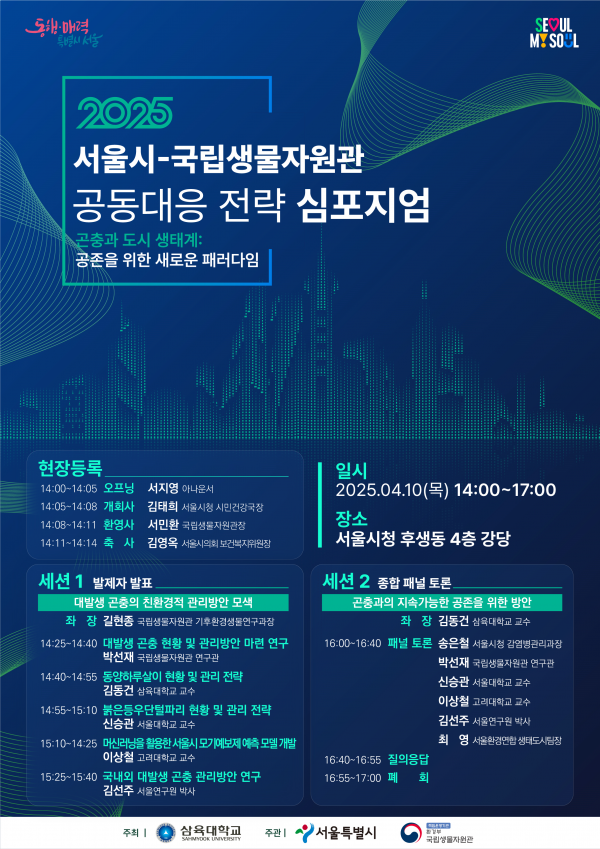 2부 종합 토론회에서는 △송은철 서울시청 감염병관리과장, △박선재 국립생물자원관 연구관, △신승관 서울대 교수, △이상철 고려대 교수, △김선주 서울연구원 박사, △최영 서울환경연합 생태도시팀장이 참여해 ‘곤충과의 지속 가능한 공존을 위한 방안’을 주제로 종합 토론을 펼칠 예정이다.