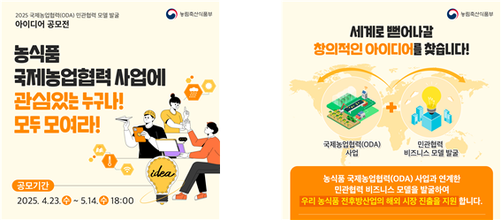 [Q뉴스] 농림축산식품부와 농림수산식품교육문화정보원는 국제기구, 기업, 정부 간 국제농업협력 사업의 협업모델을 발굴하고 기업의 사업 참여를 활성화하기 위해 ‘민관협력 모델 아이디어 공모전’을 개최한다고 밝혔다.