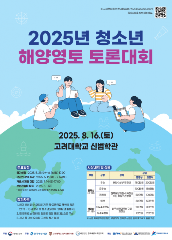 [Q뉴스] 해양수산부는 ‘2025년 청소년 해양영토 토론대회’ 및 ‘국제해양법 모의재판대회’ 참가자를 5월 21일부터 모집한다.