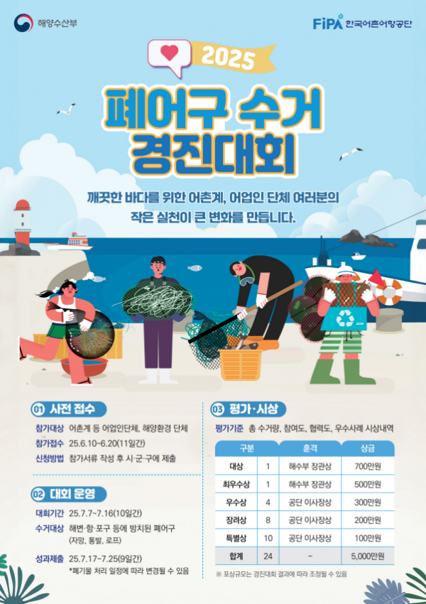 참가 대상은 전국 어촌계, 어업인단체, 해양환경단체 등이며 대회 기간 동안 지정된 장소로 수거한 폐어구를 가져오면 된다.