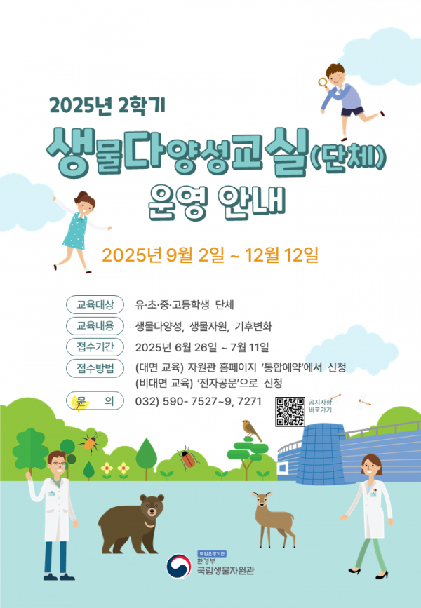[Q뉴스] 환경부 소속 국립생물자원관은 6월 26일부터 유아, 어린이, 청소년을 대상으로 2025년도 2학기 생물다양성교육 참가자를 모집한다고 밝혔다.