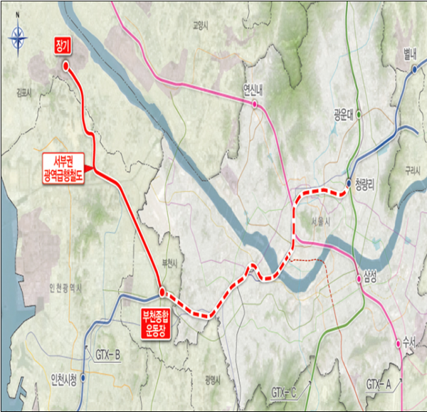 서부권 광역급행철도는 수도권 서북부 지역의 서울 도심 접근성을 대폭 개선하기 위해 김포 장기역에서 부천종합운동장역까지 21km를 신설하고 부천종합운동장역에서 수도권광역급행철도 B노선을 공용해 서울 청량리까지 총 49km를 직결운행할 수 있게 하는 사업이다.