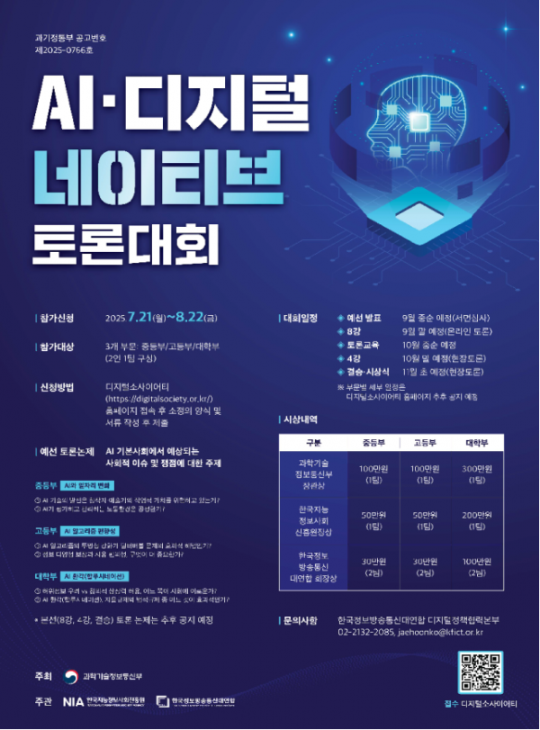 [Q뉴스] 과학기술정보통신부는 중·고·대학생을 대상으로 ‘인공 지능·디지털 원어민 토론대회’ 및 ‘인공 지능·디지털 논문공모전’을 개최할 계획이라고 밝혔다.
