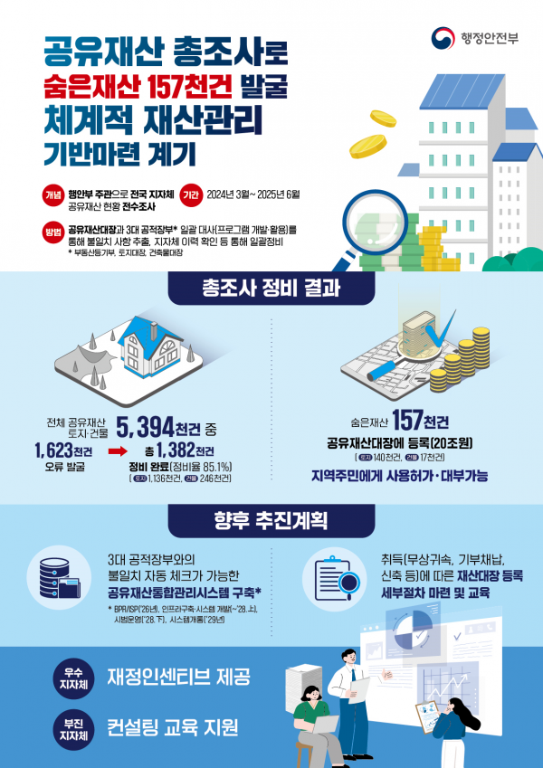 특히 총 64만 6천 건의 관리누락 재산 중 51만 3천 건을 정비하면서 공유재산대장에 등록되지 않은 15만 7천 건, 대장가격 기준 약 20조 원 규모의 숨은 재산을 발굴했다.
