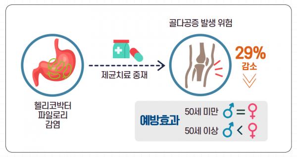 분당서울대병원에서 헬리코박터 검사를 받은 성인 846명을 대상으로 2003년부터 2023년까지 최대 20년간 추적 관찰 연구를 진행한 결과, 제균 치료를 하지 않은 그룹의 골다공증 발생은 34.5%였으나, 헬리코박터 파일로리를 성공적으로 제균한 그룹은 24.5%로 골다공증 발생 위험을 약 29% 감소시키는 것으로 확인됐다.