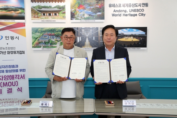 [Q뉴스] 안동시는 지역경제 활성화와 일자리 창출을 위해 8월 20일 영농조합법인 안동학가산김치와 김치류 제조공장 증축을 위한 투자 양해각서를 체결했다.