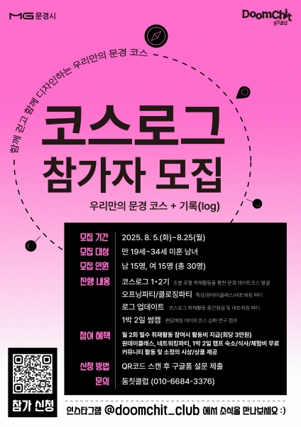 [Q뉴스] 문경시는 청춘들이 자연스럽게 만나 인연을 쌓을 수 있는 만남 주선 프로그램 ‘코스로그’를 시행하며 오는 8월 25일까지 문경 및 인근지역 거주 19세에서 34세 사이의 청년을 대상으로 남녀 각 15명씩 총 30명을 모집한다.