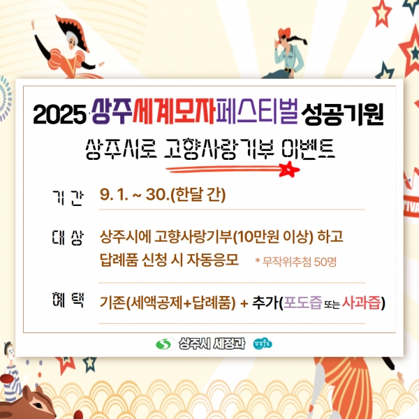 [Q뉴스] 상주시는 9월 한 달 동안 2025 상주세계모자페스티벌의 성공 개최를 응원하고 고향사랑기부제 홍보와 기부문화 조성을 위한 ‘상주시로 고향사랑기부 이벤트’를 진행한다.