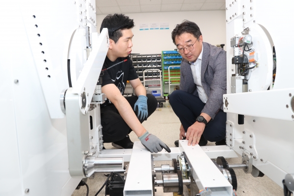 [Q뉴스] 조달청 강희훈 신성장조달기획관이 26일 세종에 위치한 재활로봇기업 휴가시스템을 방문해 혁신제품 제조과정을 살펴보고 있다.