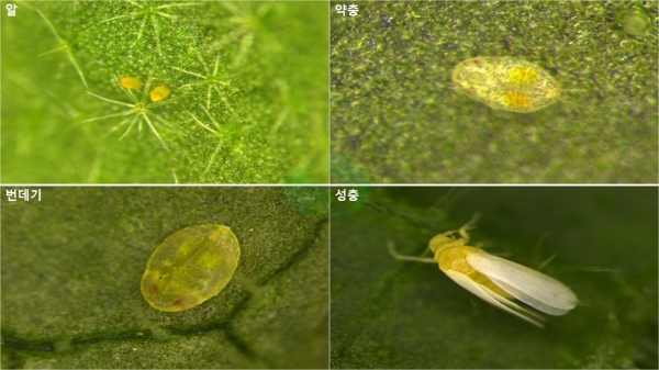 담배가루이는 알→1~3령 약충→번데기→성충의 생활사를 거친다.