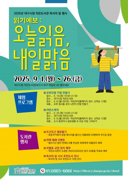 [Q뉴스] 대구광역시청 작은도서관은 9월 ‘독서의 달’을 맞아, 9월 1일부터 26일까지 4주간 ‘읽기예보: 오늘읽음, 내일맑음’ 이라는 주제로 시민을 위한 다양한 독서문화 행사를 운영한다.