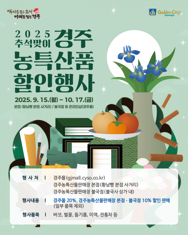[Q뉴스] 경주시는 2025 APEC 정상회의 성공개최를 기원하고 추석 명절을 맞아 9월 15일부터 10월 17일까지 ‘경주농특산물판매장 추석 특별할인행사’를 진행한다.