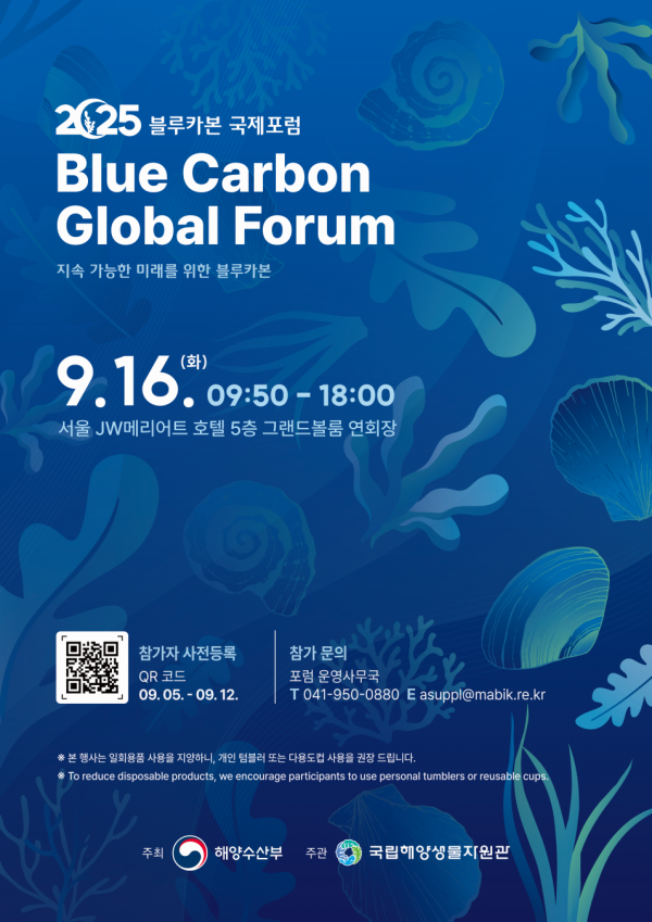 [Q뉴스] 해양수산부는 오는 9월 16일 서울 JW메리어트 호텔에서 국립해양생물자원관과 함께 ‘2025 블루카본 국제포럼'을 개최한다고 밝혔다.