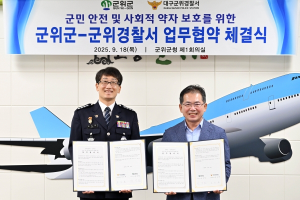 [Q뉴스] 군위군과 군위경찰서는 9월 18일 군위군청에서 군민 안전 및 사회적 약자 보호를 위한 업무협약을 체결하고 보다 안전한 지역사회 조성을 위해 상호 협력해 나가기로 했다.