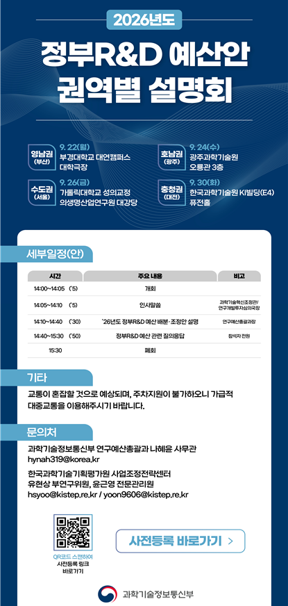 [Q뉴스] 과학기술정보통신부 과학기술혁신본부는 9월 22일부터 수도권, 충청권, 호남권, 영남권 등 4개 권역에서 2026년도 국가연구개발사업 예산안 권역별 설명회를 개최한다고 밝혔다.
