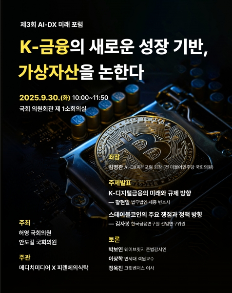 제3회를 맞이한 이번 포럼은 지난 두 차례 AI-DX 포럼에서 다뤘던 AI 기본법, AI 국가전략 논의를 넘어, 디지털금융과 가상자산이라는 새로운 성장 동력을 집중적으로 다룬다는 점에서 주목된다.