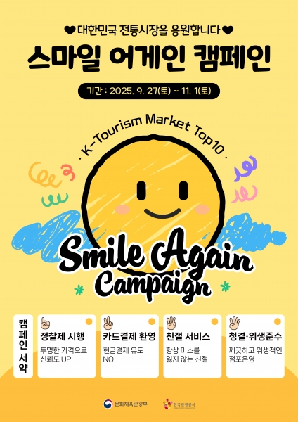 [Q뉴스] 문화체육관광부와 한국관광공사는 전국 전통시장에 활기를 불어넣고자 오는 27일부터 11월 1일까지 ‘2025 스마일 어게인 캠페인’을 전개한다.