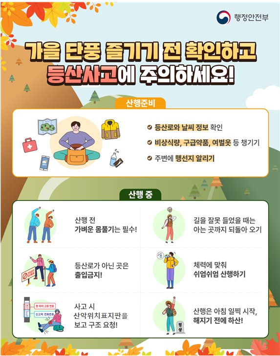 [Q뉴스] 행정안전부(장관 윤호중)는 가을 단풍철을 맞아 산행 시 실족이나 조난 등 안전사고 예방에 각별히 주의할 것을 당부했다.