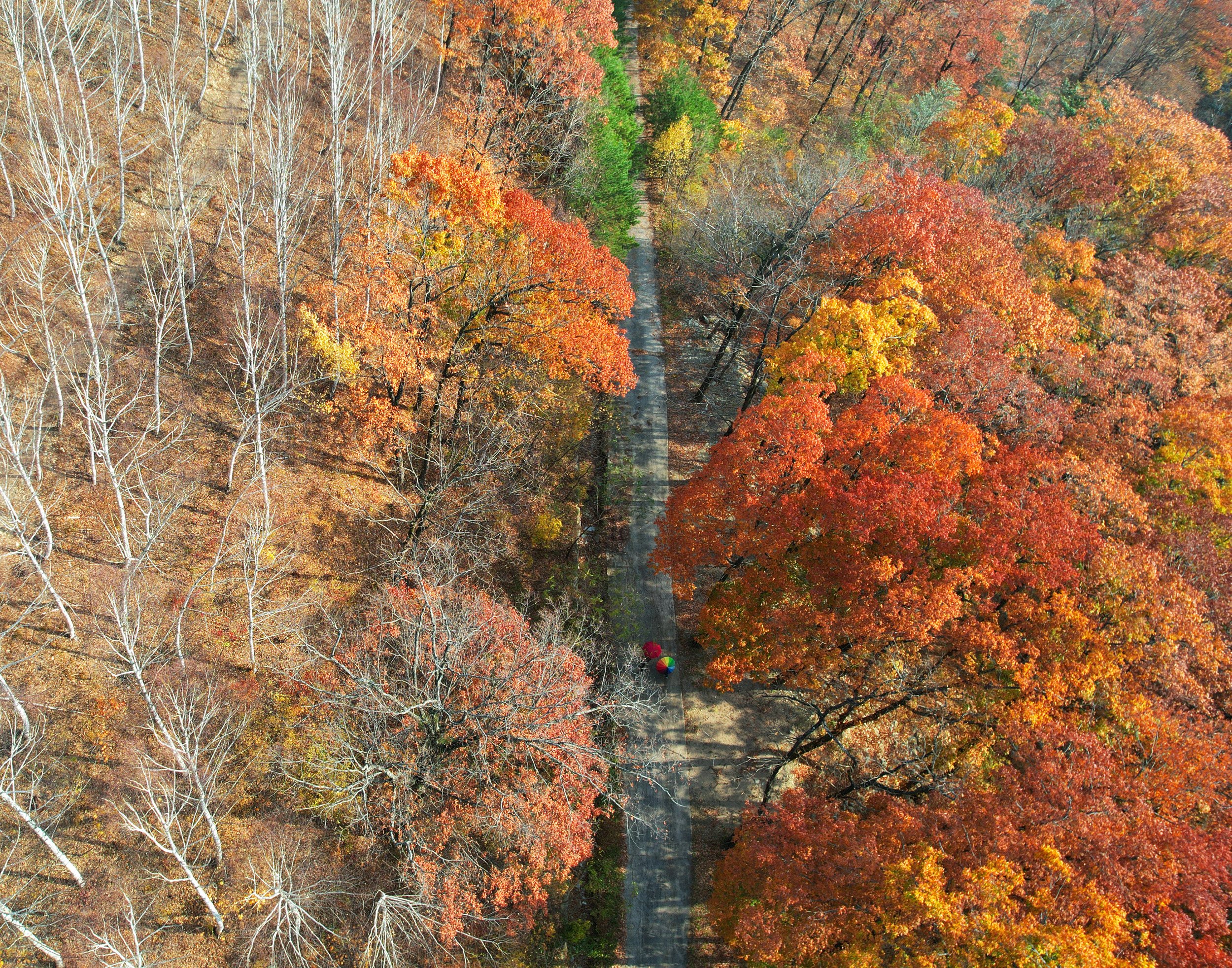 등산로를 따라 전망대로 올라가면 고도 800m를 훌쩍 넘기는 높이에서 자작나무숲 일대를 조감할 수 있다. 빼곡하게 수놓인 나무의 하얀 수피들 사이로 알록달록 피어오른 단풍은 늘상 봐오던 단풍나무들과는 색다른 감동을 선사할 것이다.