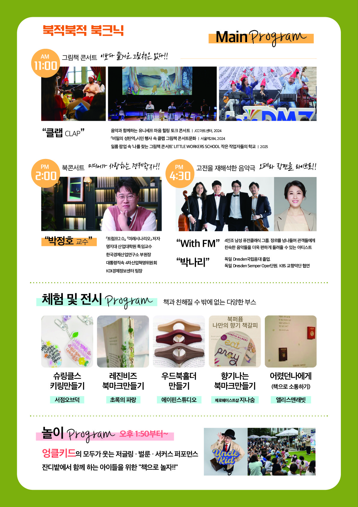 주요 프로그램은 연호공원 빈백쇼파에 앉아 책을 보는 자율독서 시간을 비롯해, 클랩스튜디오 라이브 연주팀이 함께하는 그림책 공연, ‘4차 산업혁명에서 더 책이 필요한 이유’라는 주제로 진행될 박정호 교수의 북콘서트, 동화⋅소설의 장면을 음악과 함께 재구성한 피날레 음악극으로 구성해 방문객들에게 책과 음악, 문화가 어우러진 다채로운 경험과 독서의 매력을 느끼는 시간을 만들어 줄 것으로 기대된다.