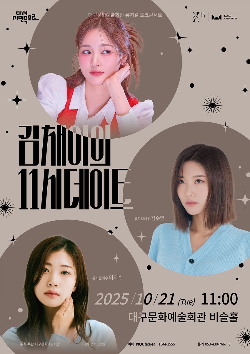 [Q뉴스] 대구문화예술회관이 선보이는 뮤지컬 토크 콘서트 ‘김채이의 11시 데이트’ 가 오는 10월 21일(화) 오전 11시, 대구문화예술회관 비슬홀에서 열린다.
