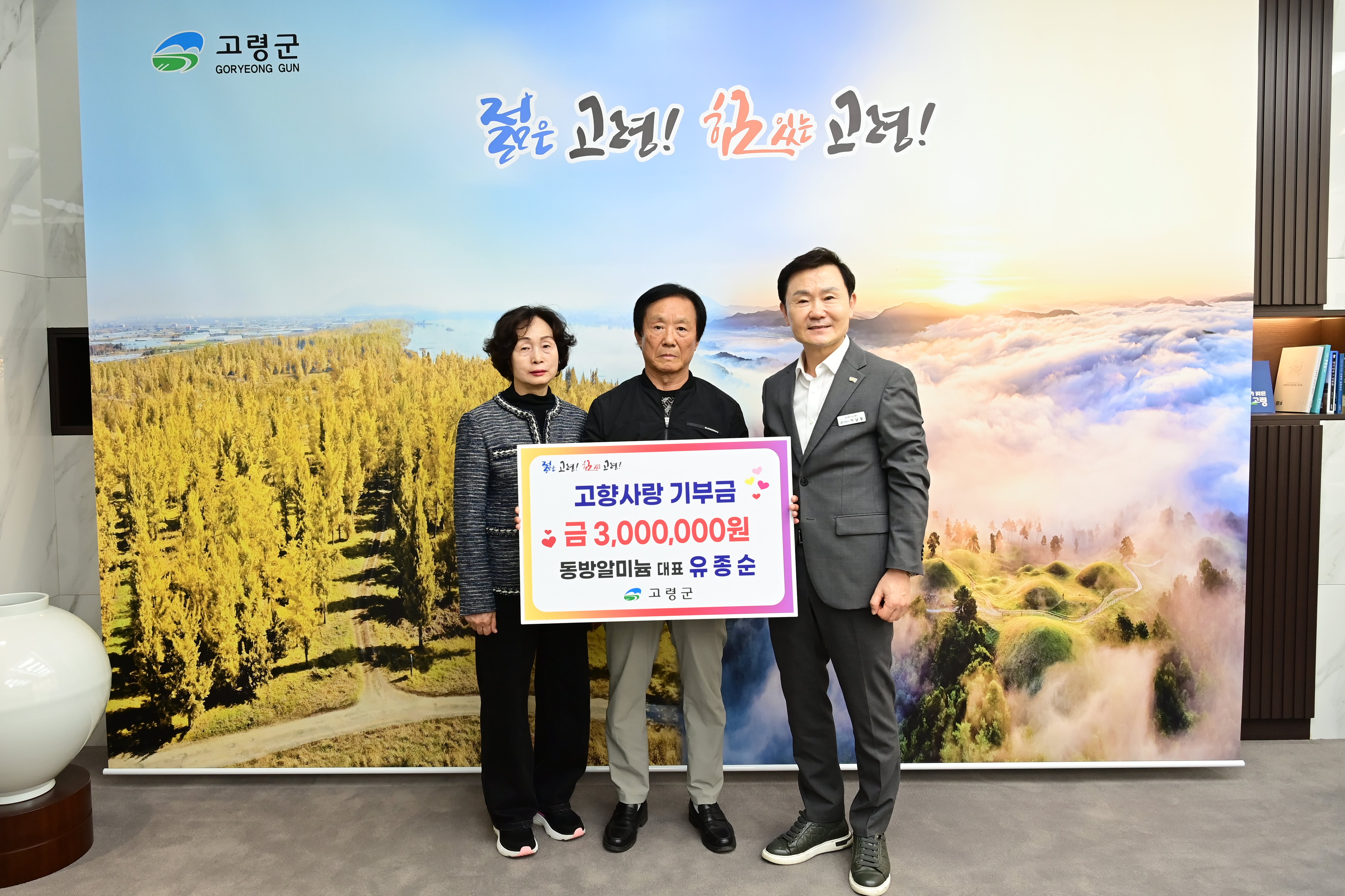 [Q뉴스] 고령군(군수 이남철)은 동방알미늄 유종순 대표가 지난 13일 고령군청을 방문해 2년 연속 고향사랑기부금 300만원을 기탁하며 고령군 지역발전에 힘을 보탰다고 전했다.