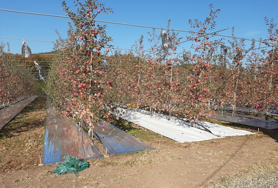 착색기에 접어든 만생종 사과는 광환경 개선을 위해 과일 주변 잎을 따주고 웃자람 가지를 제거하며 착색 증진을 위해 반사필름을 피복하는 것이 좋다.