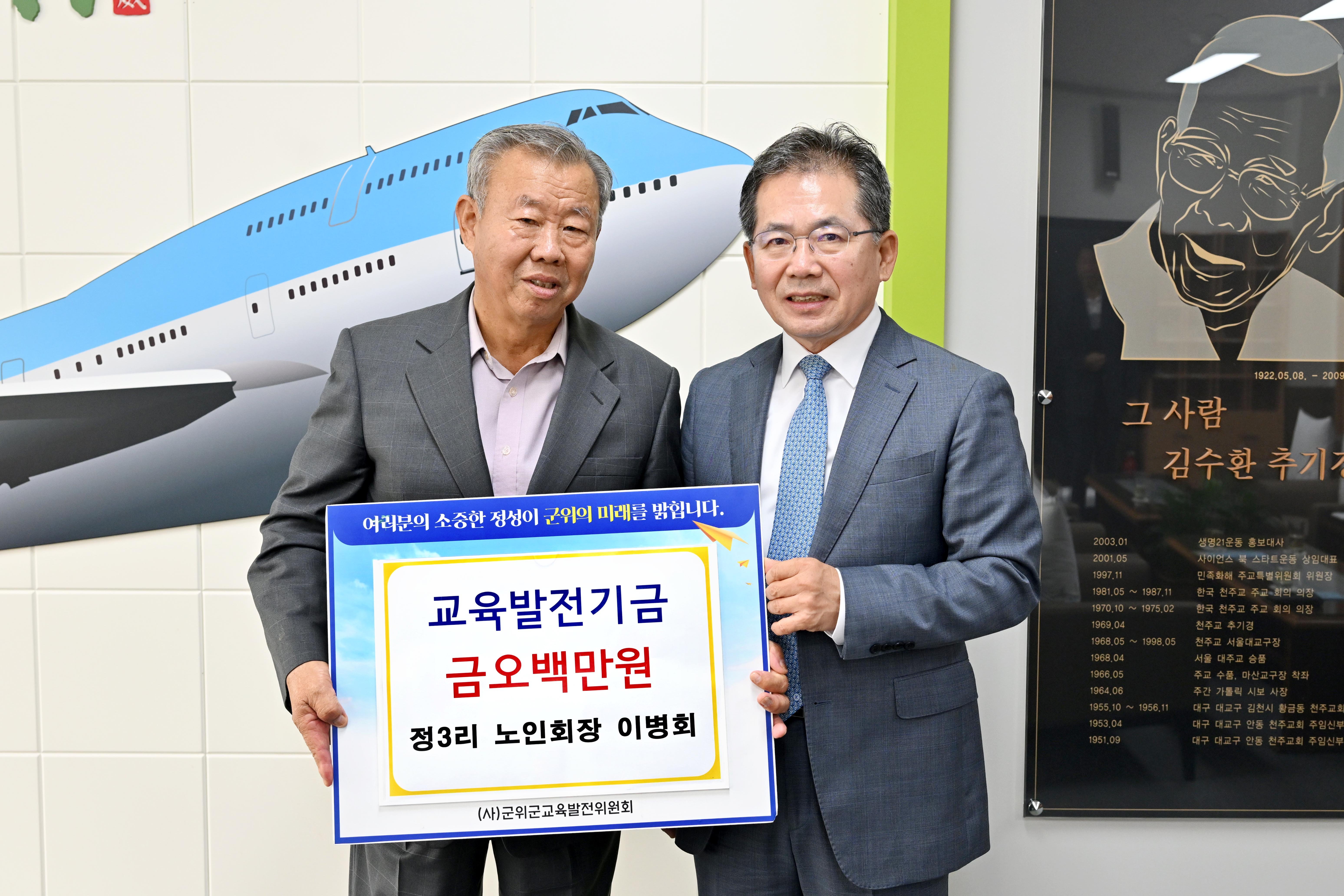 군위군교육발전위원회는 기탁해주신 분의 소중한 마음을 이어받아 지역인재육성에 최선을 다하겠다”고 밝혔다.