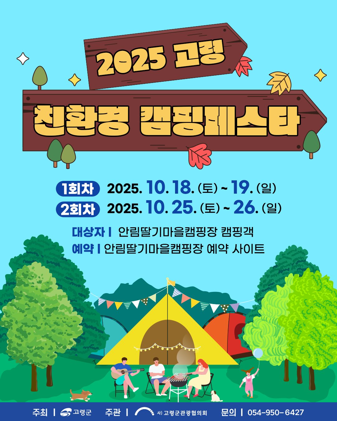 [Q뉴스] 지역과 미래를 배려하는 친환경 캠핑 문화 확산을 위해 마련된 ‘2025 고령 캠핑 페스타’ 가 오는 10월 18일(토)부터 19일(일), 10월 25일(토)부터 26일(일) 두 차례에 걸쳐 안림딸기마을캠핑장에서 열린다.